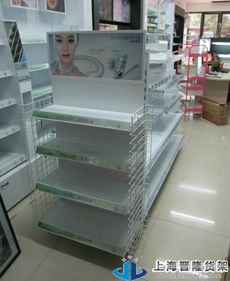 化妆品货架是超市货架的一种方式,是专门用来摆放医药用品的架子,医药超市货架的外型美观,化妆品货架表面采用环氧树脂静电喷塑处理,有多种颜色,并具有极强防腐、防锈效果,通用性好,配有各种商品陈列专用配件,适合综合性市场的需求,药品店货架摆放药品一目了然,方便拿取,简单实用.